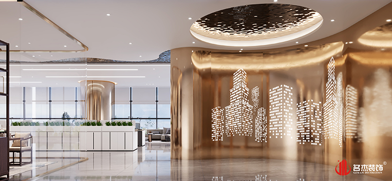 整個(gè)辦公空間使用土豪金的配色作為主調(diào)色,加入土豪金配色能夠讓辦公室裝修設(shè)計(jì)空間變得更有奢華的感覺(jué),更能夠體現(xiàn)出新能源這個(gè)行業(yè)的發(fā)展是非常有前景的。前臺(tái)區(qū)域使用鋁材沖孔板作為背景墻,加入土豪金的顏色,一下子就能夠讓人感受到這個(gè)空間奢華感。在茶室區(qū)域使用弧形玻璃,搭配有造型的天花,設(shè)計(jì)感一下子就出來(lái)了。